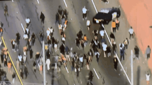 據彭博社28日報道,在洛杉磯,數百人聚集在高速公路,一些抗議者試圖攔截警車,有人則爬上車頂,還有人砸碎了警車玻璃。警車加速逃離現場,導致爬上車頂的人被甩落在地,一動不動。
