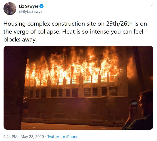 明尼阿波利斯《星論壇報》記者麗茲·索耶(Liz Sawyer)28日在推特上發佈了一張房屋工地被火焰吞噬的照片。
