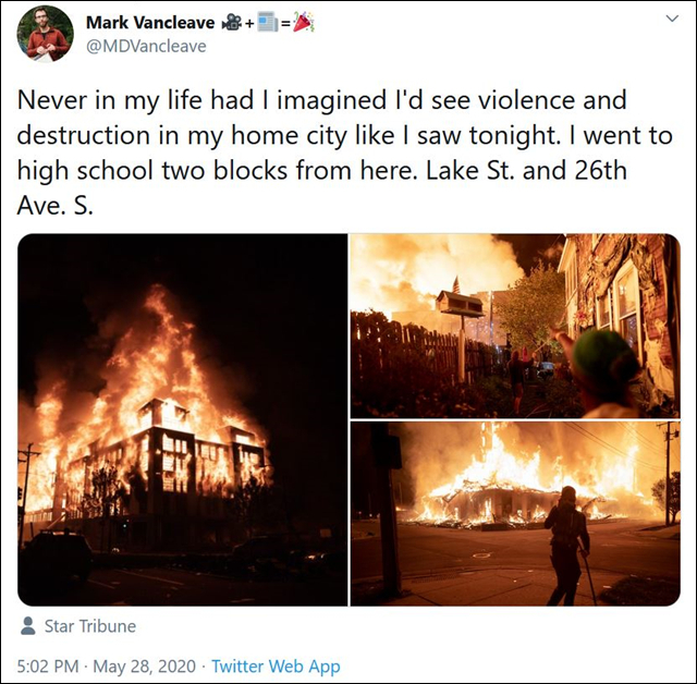 另一名《星論壇報》記者馬克·範克萊夫(Mark Vancleave)也拍到了多處火災發生地。他在推特中寫道:“很難想象,這輩子會在我的家鄉城市看到今晚這般的暴力和破壞行為。”