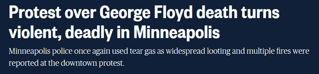 全國廣播公司報道截圖 “喬治·弗洛伊德之死在明尼阿波利斯引發的抗議變得暴力、致命”