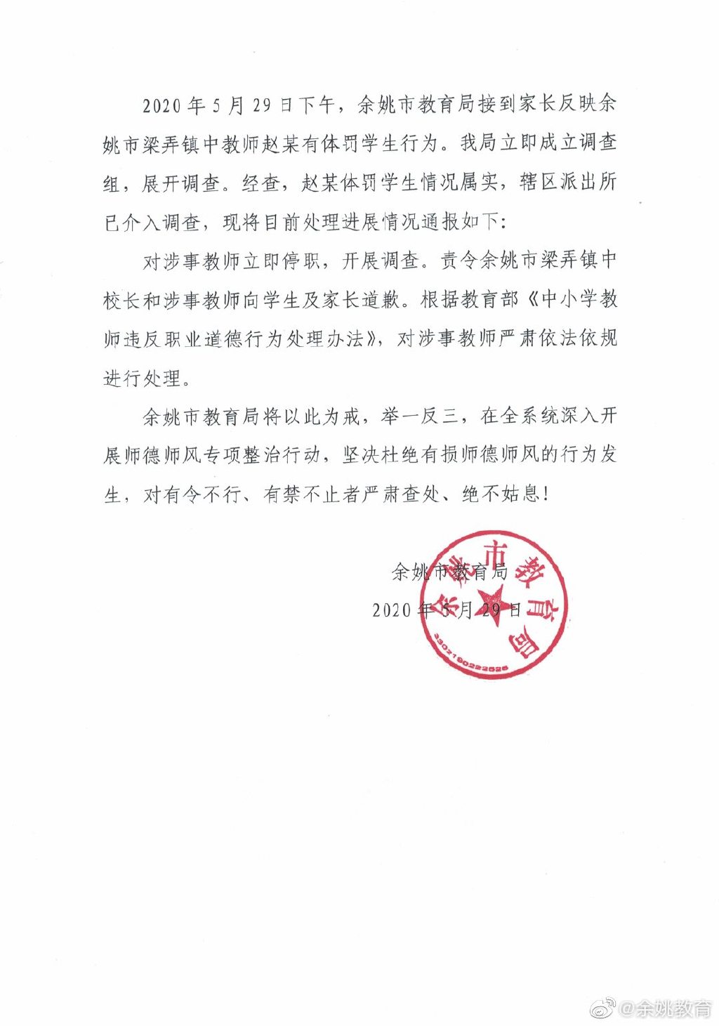2020年5月29日下午,餘姚市教育局接到家長反映餘姚市梁弄鎮中教師趙某有體罰學生行為。我局立即成立調查組,展開調查。經查,趙某體罰學生情況屬實,轄區派出所已介入調查,現將目前處理進展情況通報如下: