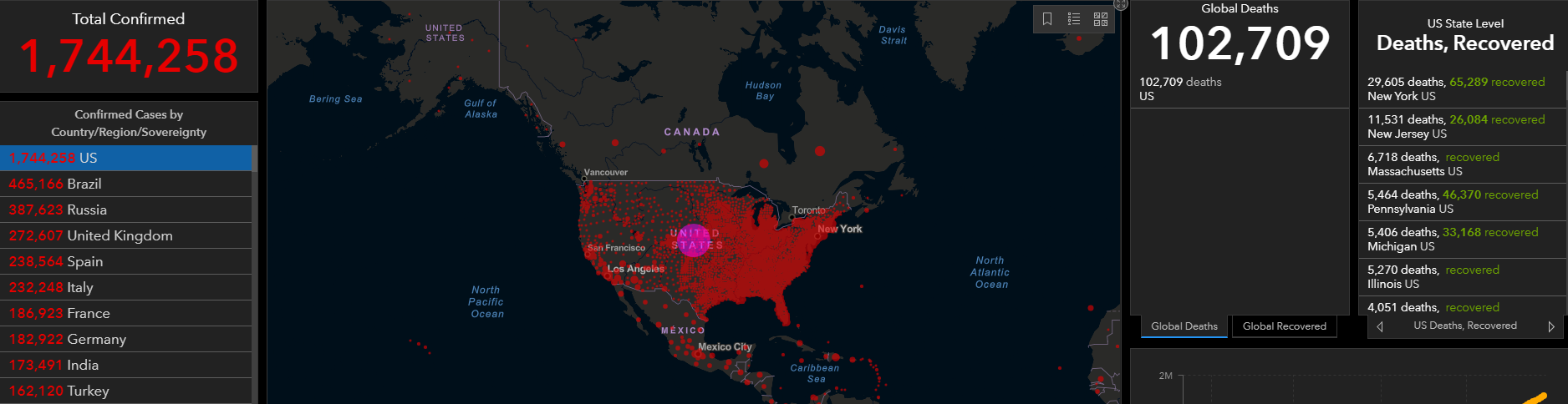(觀察者網訊)據約翰斯·霍普金斯大學發佈的全球新冠肺炎數據,截至北京時間30日6時32分,美國新冠肺炎累計確診病例1744258例,累計死亡病例102709例。