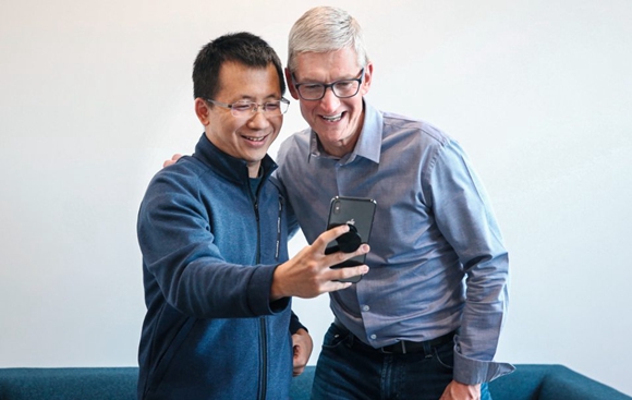 字節跳動總裁張一鳴和蘋果公司的老闆蒂姆·庫克在一起(@明鏡週刊)