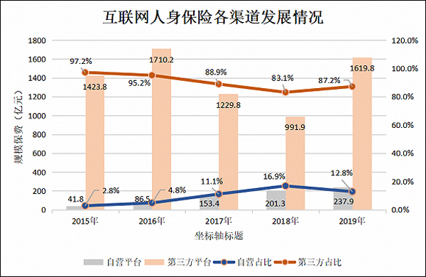 中國保險行業協會發布的2019年度互聯網人身保險市場運行情況分析報告顯示,2019年累計實現規模保費1857.7億元,較2018年同比增長55.7%。渠道方面,則是以第三方平台(渠道)合作為主,2019年通過第三方平台累計實現規模保費1619.8億元,較2018年同比增長63.3%,佔互聯網人身保險總規模保費的 87.2%。