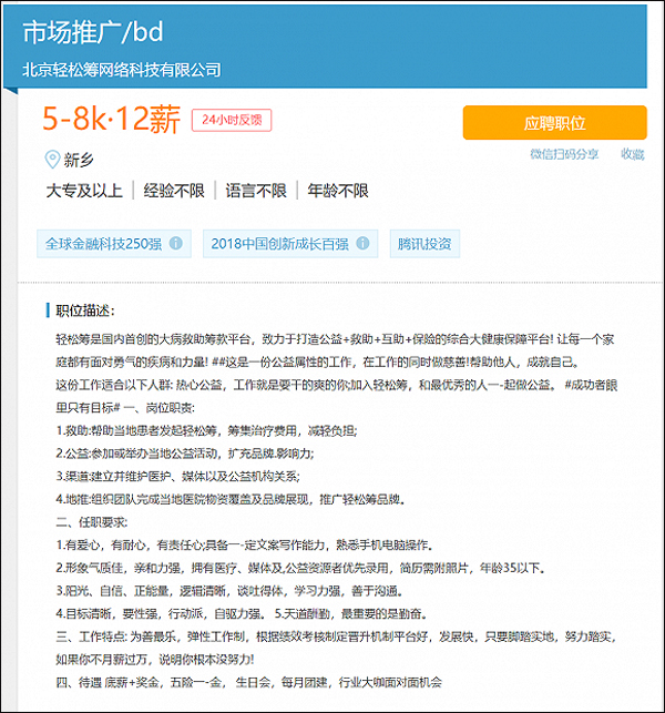 輕鬆籌同樣需要與當地醫院打交道的人,包括“市場推廣”、“bd專員”、“籌款顧問”、“業務員”、“志願者”、“市場專員”等崗位。