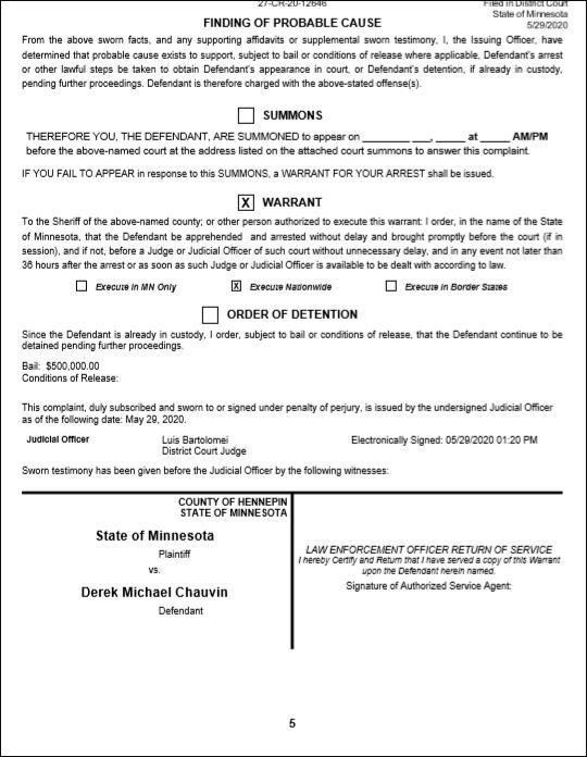 據明尼蘇達州第四司法區法院提起的刑事訴訟,暴力執法致死事件中的前明尼阿波利斯警員德里克·沙文的保釋金定為50萬美元。