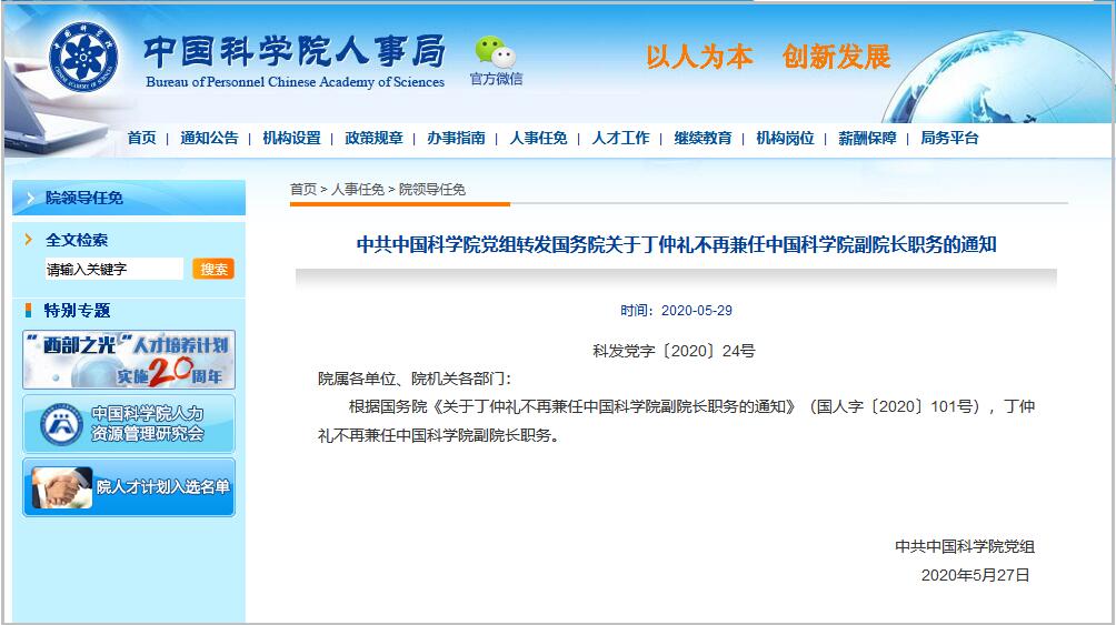 據中國科學院人事局官網5月29日消息,根據國務院《關於丁仲禮不再兼任中國科學院副院長職務的通知》(國人字〔2020〕101號),丁仲禮不再兼任中國科學院副院長職務。