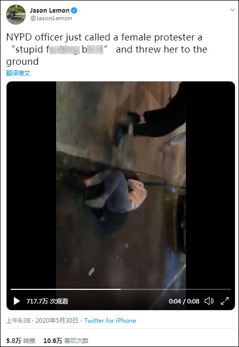 與此同時,針對警方暴力執法的指責也越來越多。《新聞週刊》記者@Jason Lemon 發佈一段8秒視頻稱,一名紐約警察辱罵一名女抗議者是“愚蠢的賤人”,然後將她一把甩到地上。