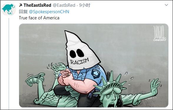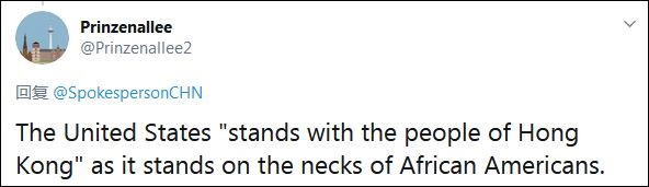 有人嘲諷稱:“美國所謂‘與香港人站在一起’,就像它站在非裔美國人脖子上一樣。”