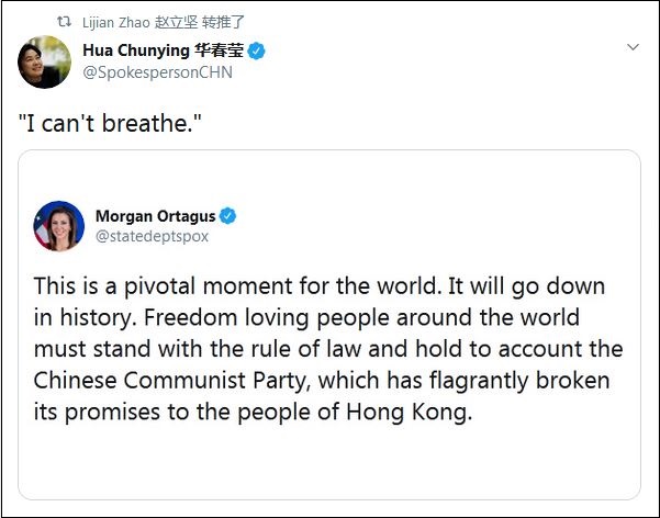 30日,奧塔格斯在推特上宣稱,全世界熱愛自由的人都應該向中國共產黨追責,因其“違背了對香港人的承諾”。隨後,華春瑩貼出了奧塔格斯推文的圖片,並配文“我不能呼吸”。另一名發言人趙立堅也跟進,轉推華春瑩。