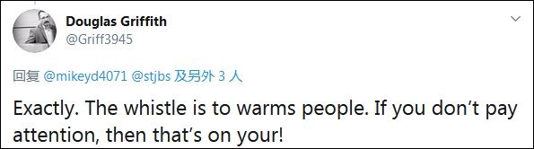 但休斯頓警察工會副會長道格·格里菲斯在推特上稱,騎警吹哨是為了提醒民眾,如果民眾沒有注意,那就是他們的錯。