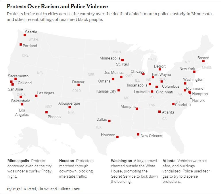今天全美包括首都華盛頓在內的各大城市爆發了大規模示威遊行。這是我40年來,從未見過如此規模的全國動亂。