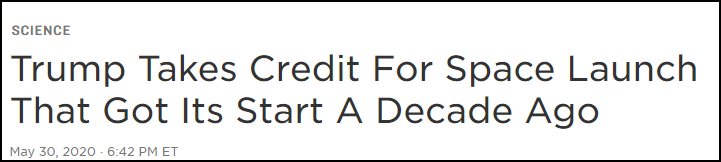 美國國家公共廣播電台(NPR)5月30日發文,題為“特朗普把10年前就開始的太空計劃的功勞佔為己有”。文章稱,“實際上,是過去的兩任總統將NASA扶上正軌,才有了這次SpaceX的發射成功。但是如果聽發射後的演講,很容易忽視這一點。”