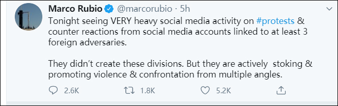 而“反華急先鋒”共和黨參議員盧比奧,30日晚則在推特上宣稱,社交媒體上出現關於美國國內抗議活動及當局反應的大量信息,其發佈者賬號都與“至少三個外國對手”有關聯。他宣稱這些賬號“從多個角度煽動暴力、挑撥對抗”。