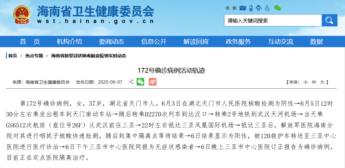 據介紹,第172號確診病例,女,37歲,湖北省天門市人。6月3日在湖北天門市人民醫院核酸檢測為陰性→6月5日12時30分左右乘坐出租車到天門南動車站→隨後轉乘D2270次列車到達漢口→轉乘2號地鐵到武漢天河機場→當天乘GS6512次航班(座位號26F)從武漢前往三亞→22時左右抵達三亞鳳凰國際機場→抵達三亞後,解放軍醫院海南分院對其進行咽拭子核酸快速檢測,隨後到集中隔離點等待結果→6日結果顯示為陽性,被120救護車轉送至三亞中心醫院進行醫療診治→6日下午三亞市中心醫院網報為無症狀感染者→6日晚上三亞市中心醫院訂正報告為確診病例,目前正在定點醫院隔離治療。