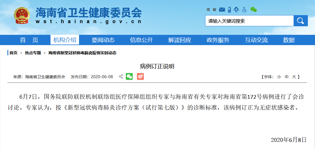 海南省衞健委官網6月8日發佈《病例訂正説明》。説明稱,6月7日,國務院聯防聯控機制聯絡組醫療保障組組織專家與海南省有關專家對海南省第172號病例進行了會診討論。專家認為,按《新型冠狀病毒肺炎診療方案(試行第七版)》的診斷標準,該病例訂正為無症狀感染者。