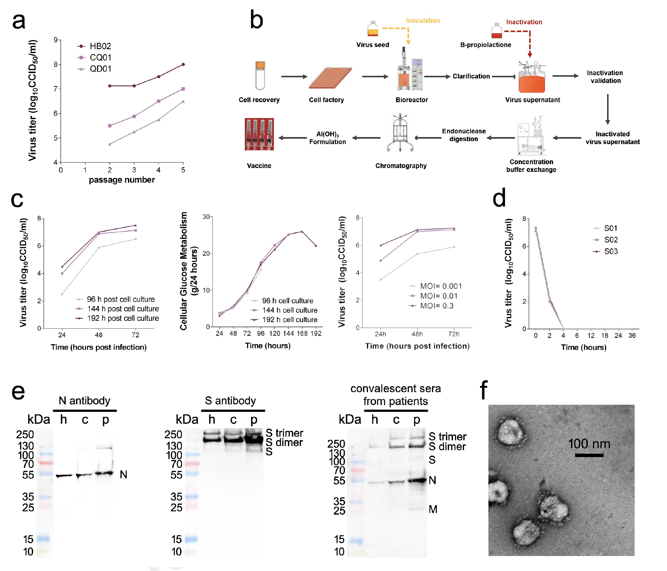 為了高效製造,研究者建立了基於新型籃式反應器載體的BBIBP-CorV的原料生產策略(圖1b)。對Vero細胞中P7培養基的生長動力學分析顯示,培養基病毒能夠有效複製,在感染後48-72小時(hpi)達到最高滴度超過7.0 log10 CCID50,感染多重度(MOI)為0.01-0.3(圖1c)。為了滅活病毒產生,研究者在2-8℃,以1:40的比例將丙酸內酯與收穫的病毒溶液充分混合。病毒的3批滅活消除了病毒的感染性,驗證了滅活過程良好的穩定性和重複性(圖1d)。Western-blotting分析顯示,疫苗庫中含有病毒結構蛋白(保護性抗原)(圖1e)。負染色的電子顯微鏡圖像顯示橢圓形病毒顆粒,直徑約為100 nm(圖1f)。