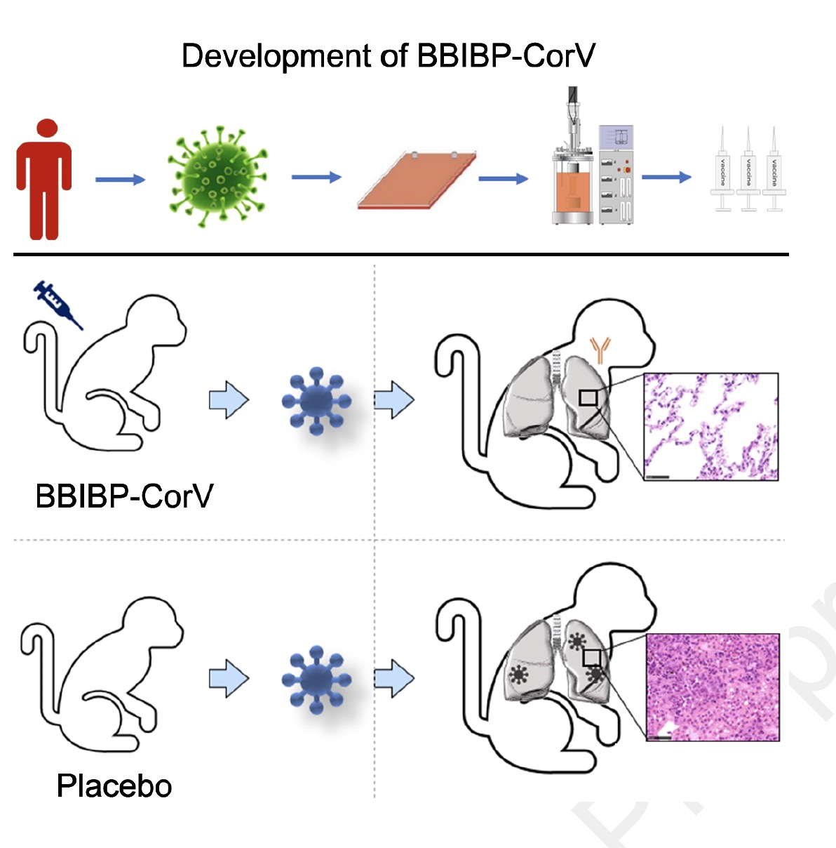 研究者詳述了SARS-CoV-2滅活候選疫苗(BBIBP-CorV)的實驗性生產,該疫苗在小鼠、大鼠、豚鼠、兔子和非人靈長類動物(食蟹猴猴子和恆河猴)體內均能誘導高水平的中和抗體滴度,以提供對SARS-CoV-2的保護。在恆河猴的氣管內免疫接種中,研究使用2μg/劑量的BBIBP-CorV便可提供了對SARS-CoV-2的高效保護,同時沒有檢測到抗體依賴性增強(ADE)感染。此外,BBIBP-CorV在疫苗生產中表現出高效的生產力和良好的遺傳穩定性。