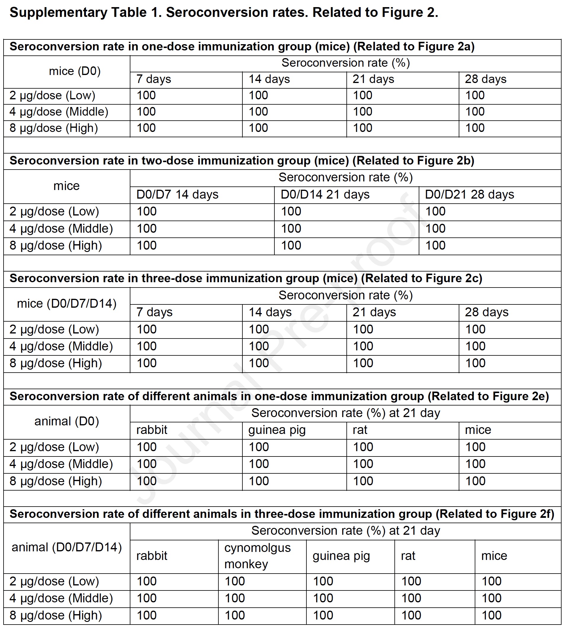 研究者還測試了三劑免疫程序的免疫原性。他們在0天、7天和時14 天在小鼠腹腔接種三種劑量的疫苗,分別是高(8μg /劑)、中(4μg /劑)或低(2μg /劑)疫苗 (圖2c)。在第7、14、21、28天測定各組的中和抗體水平,在第一次免疫後第7天,三組血清轉化率均達到100%(圖2c,補充表1)。