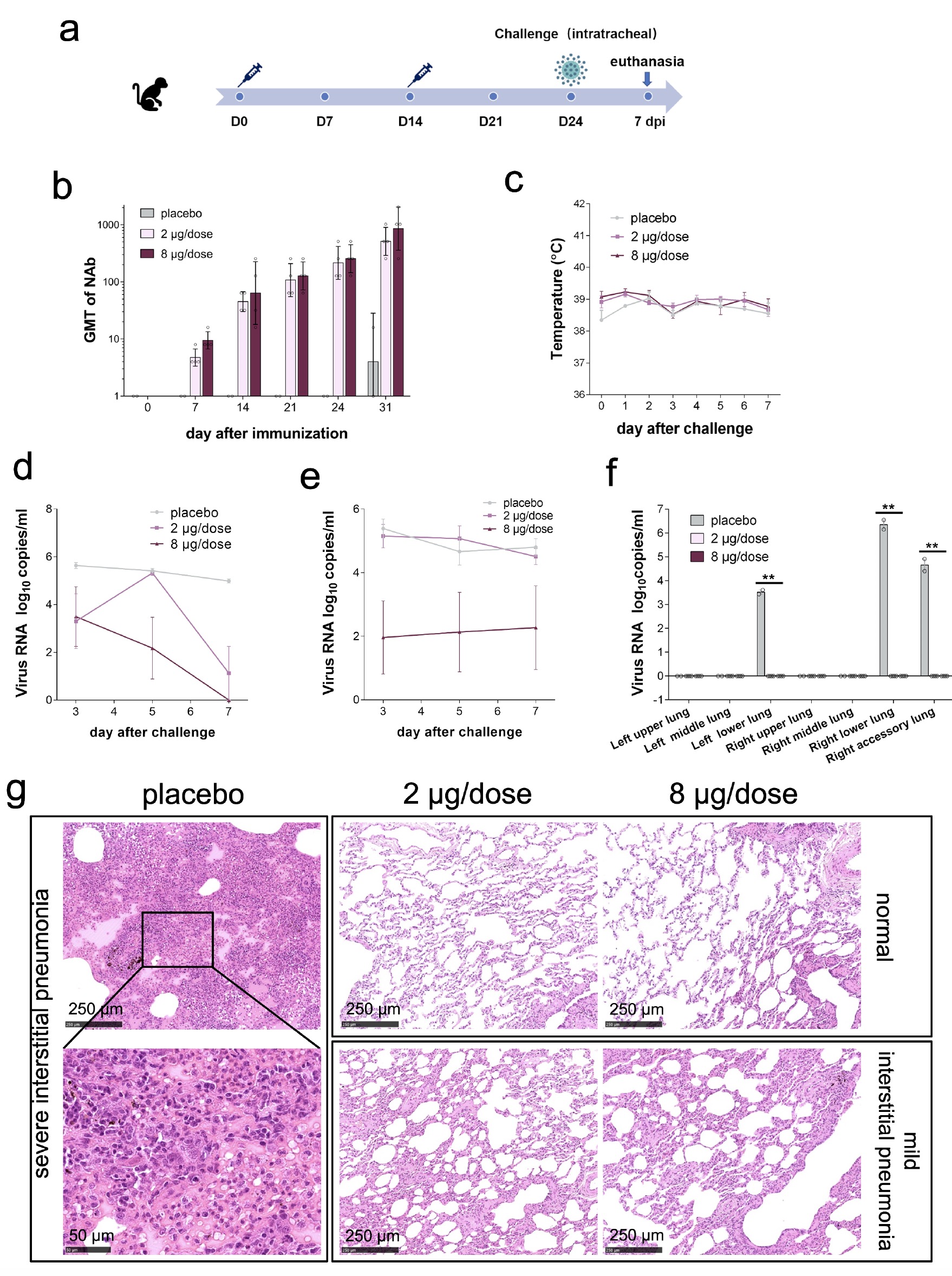 所有的恆河猴在第0天(D0)和第14天(D14)免疫2次。安慰劑組肌肉注射生理鹽水,兩組實驗組肌肉注射低劑量(2μg/劑)或高劑量(8μg/劑)BBIBP-CorV(圖3a)。病毒攻毒前,低劑量組和高劑量組的NAb GMT分別達到215和256(圖3b)。在D24(第二次免疫後第10天),所有恆河猴在麻醉下經氣管注射l06 TCID50的SARS-CoV-2。病毒感染後0 至7天,接種組和安慰劑組的體温在範圍內波動(圖3c,補充圖4a)。
