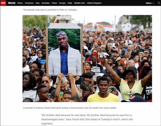 2016年,法國巴黎北郊24歲的黑人特拉奧雷在警方拘留所離奇死亡。CNN稱,特拉奧雷案件與弗洛伊德案件極其相似,二者都是黑人、都在與警察的交涉中死去、都在生命的最後時刻掙扎着努力呼吸。