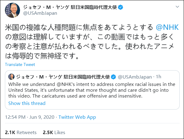 這則動畫引起了美國駐日本臨時代理大使約瑟夫·楊(Joseph·M·Young)的注意。他用英文和日語同時發表推特表示,“我們理解NHK意在對焦美國複雜的種族問題,但遺憾的是這則動畫在製作時沒有充分思考,不夠謹慎。使用的動畫人物也有冒犯性、欠缺考量。”