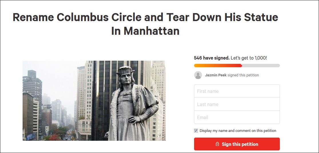 例如,該網站用户“Frederick Joseph”8日上傳一份請願書,請求紐約市長白思豪重新命名曼哈頓的地標“哥倫布圓環”,並拆毀曼哈頓的哥倫布雕像。簡介中寫道:“哥倫布謀殺、奴役、強姦、掠奪並摧毀土著人和黑人。他不應該再因為掠奪土地、同時在美國歷史性野蠻行為中扮演重要角色而受人尊敬……新的雕像應該致敬萊納佩人(Lenni-Lenape,美洲原住民),他們才是紐約市的第一批居民。”