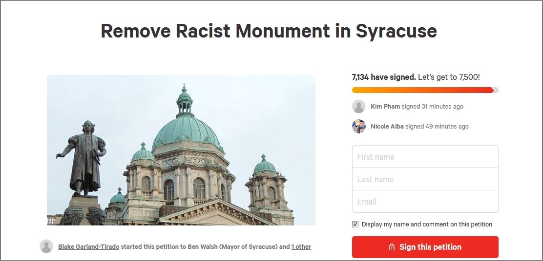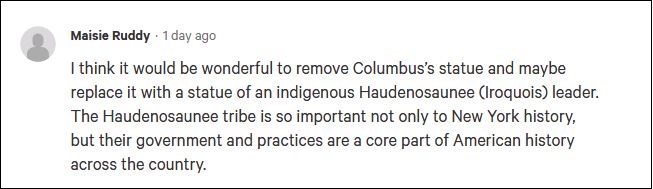 在這些請願書的下方,不少評論都對這些請願書表達了支持之情。例如,在錫拉丘茲的請願書下方,最高贊評論寫道,移除哥倫布雕像是件好事,應該用原住民的雕像取而代之。