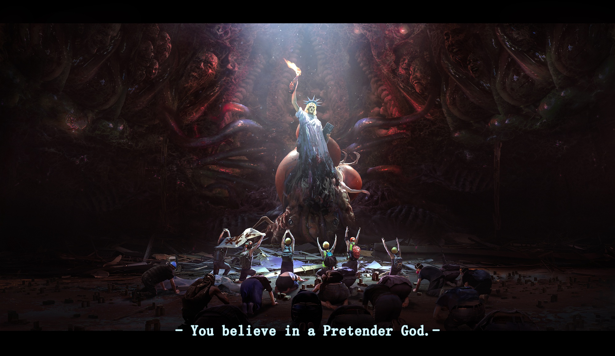 **烏合麒麟:**是從去年香港系列事件的時候開始的,最初的動機是因為看了一些相關新聞而感到憤怒,然後有一天看到香港某漫畫家的一系列宣傳暴力美化動亂的漫畫作品,於是我也想用類似的方式回擊,就有了第一張作品——《偽神》。