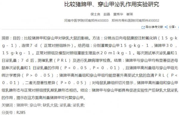 之前説的那個視頻裏,引用了幾篇綜述性文章。比如《穿山甲應用及炮製研究進展》,點進去一看,裏面引用的泌乳研究,僅僅是動物實驗。動物實驗只是提示可以進行臨牀研究,但本身根本不具備臨牀指導價值。