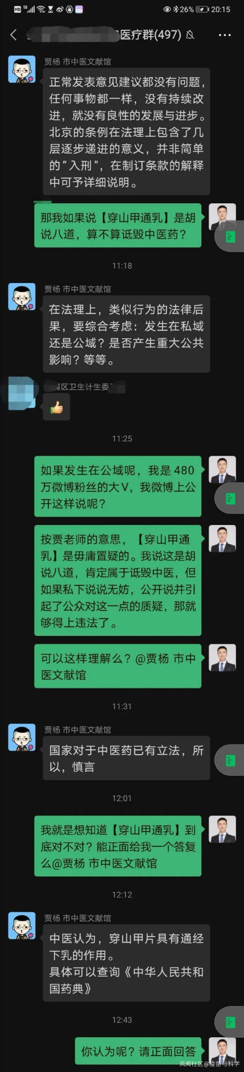 這幾天,擁有480萬微博粉絲大V的陶醫生在一個醫療羣內,追着某市中醫文獻館的賈先生問:“我如果説‘穿山甲通乳’是胡説八道,算不算詆譭中醫藥?”“穿山甲通乳到底對不對?”