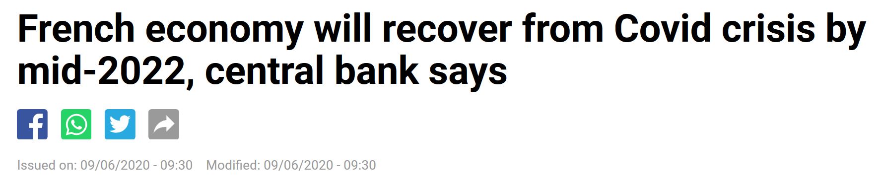 (觀察者網訊)據法國媒體“法蘭西24小時(French24)”網站當地時間6月9日報道稱,法國央行週二發佈報告稱,由於新冠疫情大流行,法國今年的經濟萎縮幅度約為10%,到2022年中期才能恢復到危機前的水平。