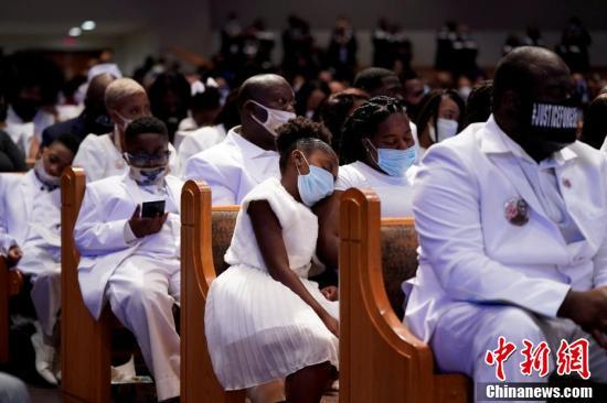 據路透社6月9日報道,當天弗洛伊德的葬禮在得克薩斯州休斯頓的“讚美噴泉”教堂舉行。包括他的家人、神職人員和當地政客在內,約500多名來賓出席身着白色服飾出席了他的葬禮。