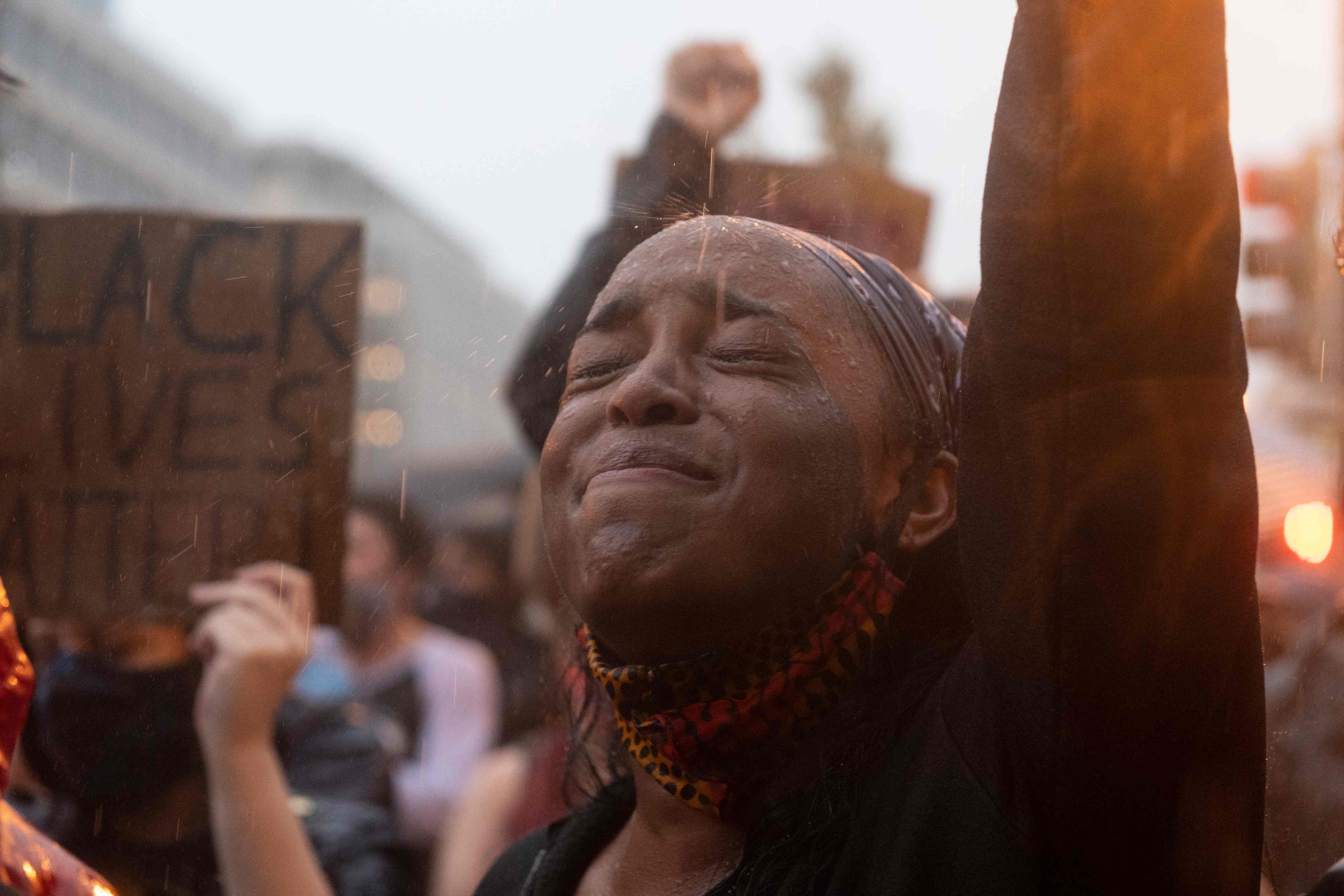 6月5日,在美國華盛頓,人們冒雨參加抗議活動。新華社/法新