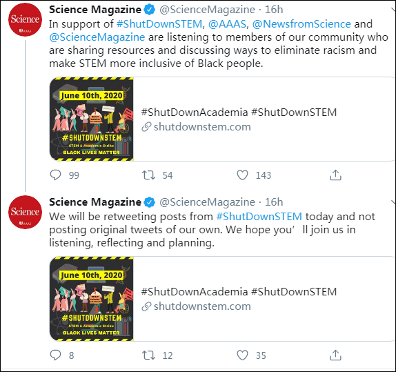 美國科學促進會出版的《科學》雜誌也響應罷工,稱要傾聽組織成員的分享,討論消除種族主義的方法,讓STEM對黑人更加包容。該組織還邀請了12萬名成員參與這項工作。