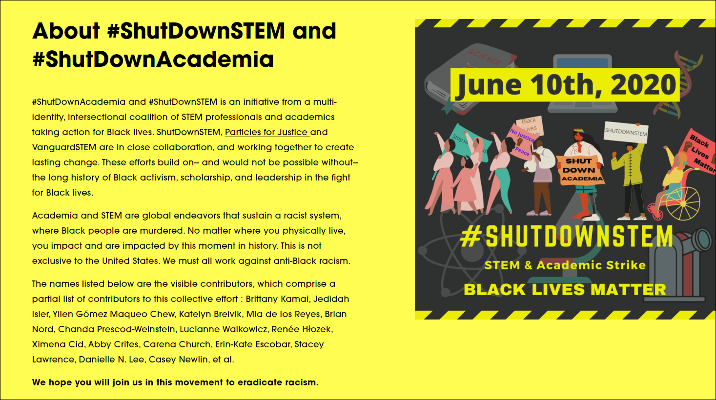 “為黑人生命罷工”活動是由兩個科學小組策劃的,他們呼籲學術界集體在6月10日這天進行罷工,併為活動打上“關停學術界”、“關停STEM(科學、技術、工程和數學)”的標籤,以聲援“黑人的命也是命”的示威行動。