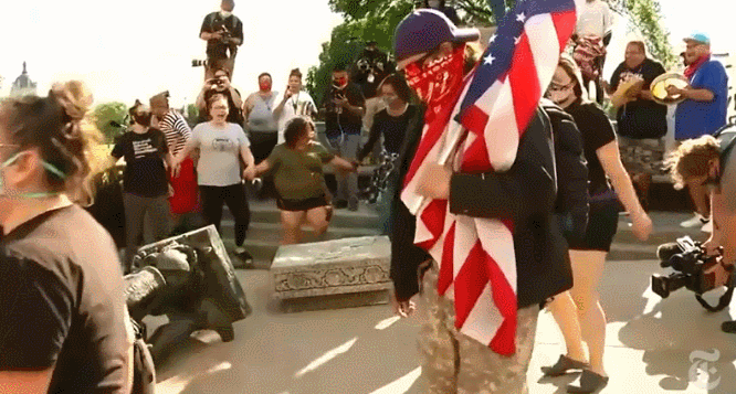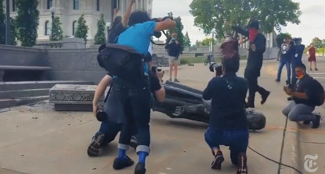 如今抗議持續十幾天,已經從簡單粗暴的打砸搶燒進入到另一個階段:“哥倫布”們一個接一個倒下;“亂世佳人”們一部接一部下架;就連老牌精英媒體《紐約時報》們也小心“站隊”,一步踏錯就會遭到口誅筆伐……