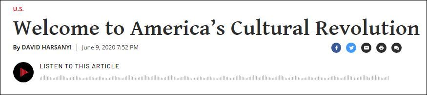 除了福克斯,保守派雜誌《國家評論》也在6月9日發了這麼一篇文章:《歡迎來到美國的文化革命》。文章一開始就寫道:“我們正在一場高科技的,不流血的文化革命的黎明。靠恐嚇和公開羞辱來決定哪些言論和想法是可以發表的。”