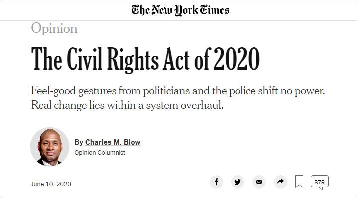 作者提出,如果真的要在公共場合而不僅僅是在警察隊伍中打擊種族不平等,需要的就是一個新的民權法案,《2020年的民權法案》。