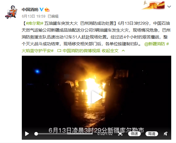 應急管理部消防救援局官方微博@中國消防 6月13日傍晚消息,6月13日3時29分,中國石油天然氣運輸公司新疆成品油配送分公司5輛油罐車發生火災,現場情況危急,巴州消防救援支隊迅速出動12車51人趕赴現場處置。經過近4個小時的艱苦鏖戰,整個滅火戰鬥成功結束,現場移交相關部門後,各單位按建制歸隊。