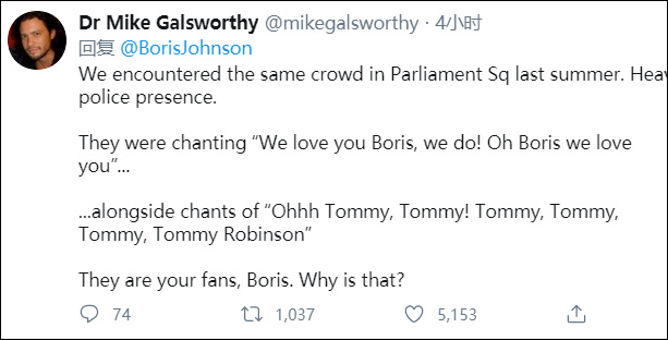 熱評第一的網民表示:“去年夏天這羣人也在議會廣場舉行了集會,他們高呼’我們愛你,鮑里斯,我們做到了’,對了,他們還高呼‘湯米·羅賓遜’(著名英國反伊斯蘭教極右翼主持人)。這些人可是你的粉絲,想想為什麼會這樣。”