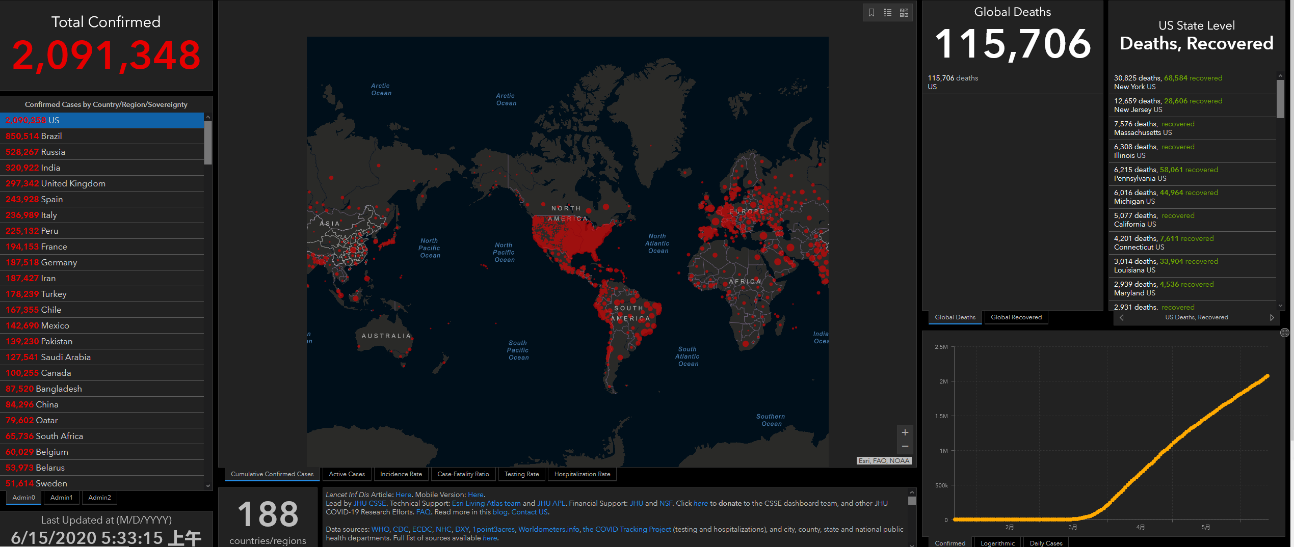 (觀察者網訊)據約翰斯·霍普金斯大學發佈的全球新冠肺炎數據,截至北京時間6月15日5時33分(美東時間6月14日17時33分),美國新冠肺炎累計確診病例2091348例,累計死亡病例115706例。