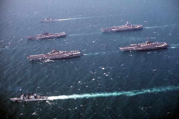 台海衝突一旦爆發,航母將成為美國干涉主力,海灣戰爭中Battle Force Zulu這樣的航母艦隊也是戰術核打擊的理想對象,這裏有“中途島”號(上左)、“突擊隊員”號(下左)、“羅斯福”號(上右)和“美國”號(下右)航母,另加“邦克山”號(上)、“萊特灣”號(下)、“諾曼底”號(不在圖中)巡洋艦和其他艦艇
