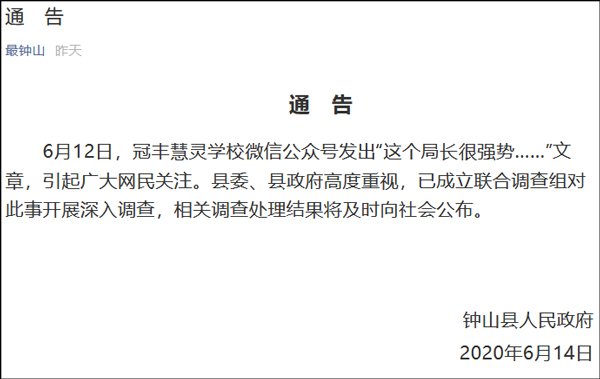 6月14日下午,鐘山縣人民政府發佈通告稱:6月12日,冠豐慧靈學校微信公眾號發出“這個局長很強勢……”文章,引起廣大網民關注。縣委、縣政府高度重視,已成立聯合調查組對此事開展深入調查,相關調查處理結果將及時向社會公佈。