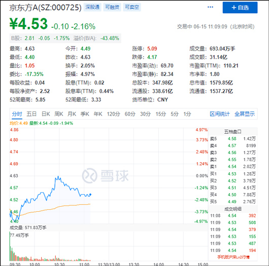 觀察者網就此詢問了京東方,京東方方面沒有回應。截至發稿,京東方A報4.53元/股,跌幅2.16%。