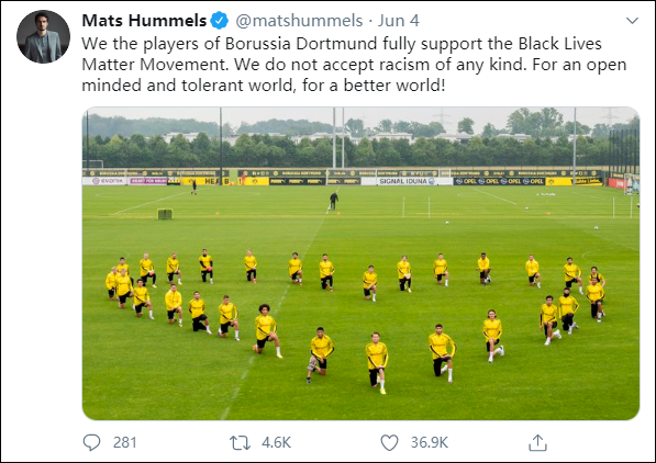 德國球員胡梅爾斯也曬出照片稱,“我們不接受任何形式的種族歧視”,圖中多特蒙德隊員們組成愛心型隊列,集體單膝下跪。