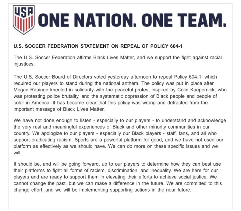 廢除了604-1號政策,實際上就是默許運動員等在國歌時用跪地方式表示抗議。聲明最後,美足協稱,“以後,將由運動員自己決定是否將賽場用於反種族主義、歧視和不平等的平台;將堅決與運動員站在一起,努力爭取社會公平與正義。”