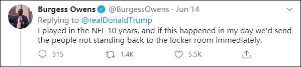 退役橄欖球運動員博格思·歐文斯(Burgess Owens)在該推文下方發聲,稱“我在聯盟打了10年,如果下跪發生在我那個年代,我們會把沒有站着的傢伙直接送回更衣室。”