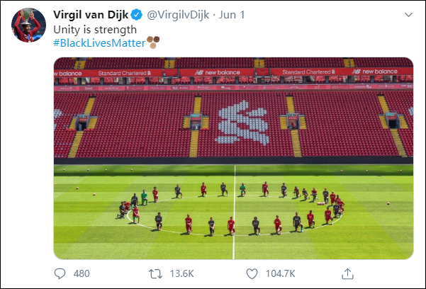 6月1日,英超球隊利物浦球員範迪克在推特上發佈一張照片,隊員們在安菲爾德球場集體單膝跪地,並配文“團結就是力量”,聲援“黑人的命也是命”示威運動。其他隊員也紛紛效仿。