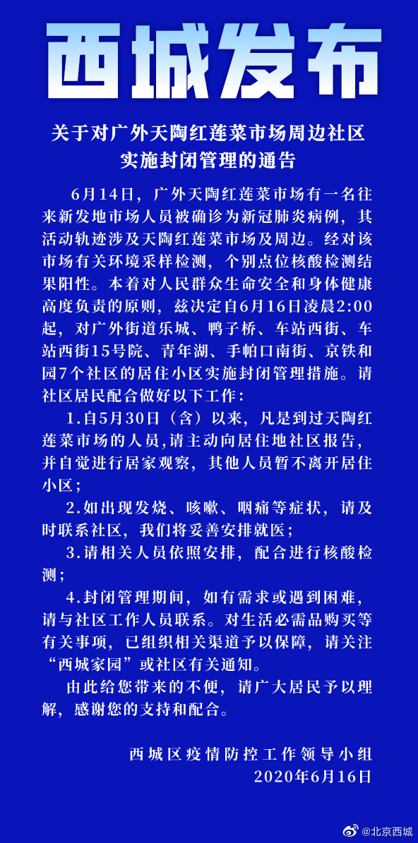北京市西城區人民政府新聞辦公室官方微博(@北京西城)6月16日發佈公告, 6月14日,廣外天陶紅蓮菜市場有一名往來新發地市場人員被確診為新冠肺炎病例,其活動軌跡涉及天陶紅蓮菜市場及周邊。經對該市場有關環境採樣檢測,個別點位核酸檢測結果陽性。本着對人民羣眾生命安全和身體健康高度負責的原則,茲決定自6月16日凌晨2:00起,對廣外街道樂城、鴨子橋、車站西街、車站西街15號院、青年湖、手帕口南街、京鐵和園7個社區的居住小區實施封閉管理措施。